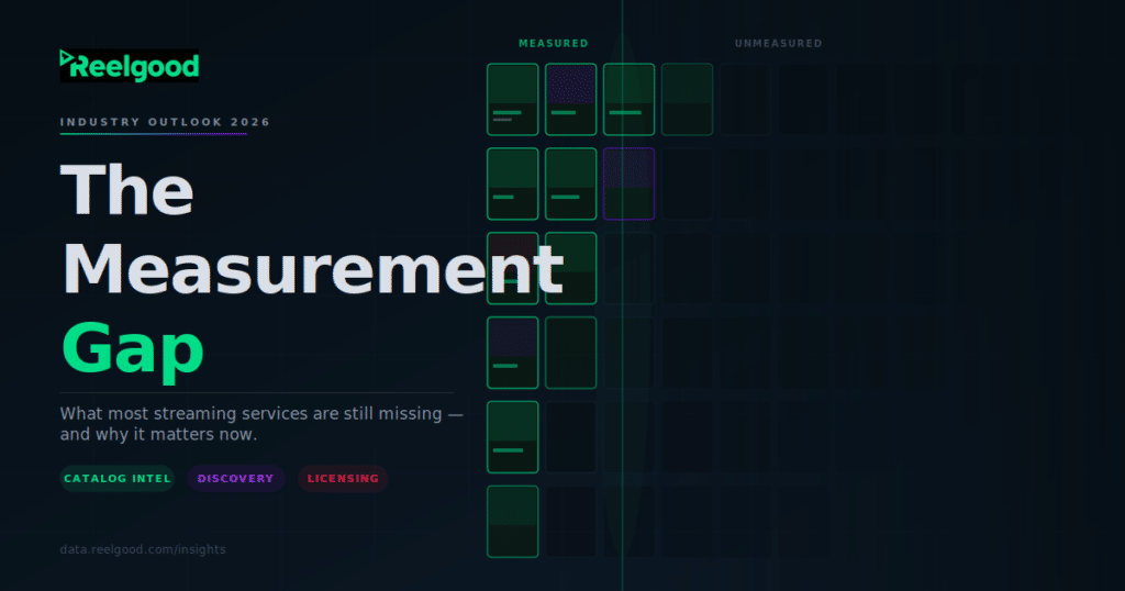 Next in our series on the Reelgood team’s 2026 Streaming Industry Predictions. Key Takeaways Most streaming services lack real-time visibility into competitors’ and partners’ catalogs, creating dangerous blind spots in acquisition, renewal, and licensing compliance decisions. Per-title content ROI remains one of streaming’s hardest unsolved measurement problems. Assigning meaningful monetary value to content on a…