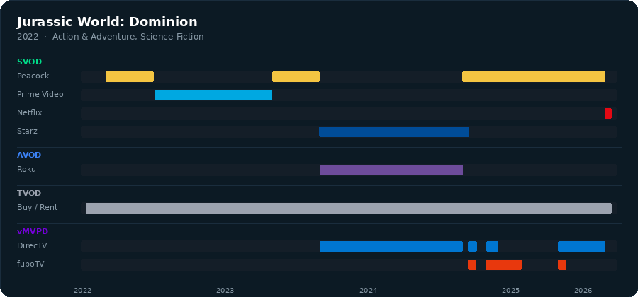 Example: Jurassic World Dominion streaming availability timeline across SVOD, AVOD, TVOD, and vMVPD services